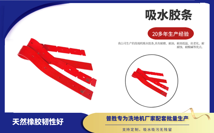 產(chǎn)品說明:吸水膠條是洗地機(jī)吸水扒上的重要部件,作用就是與地面接觸,產(chǎn)生一個密封的空間,把地面上的污水通過風(fēng)機(jī)進(jìn)行回收。吸水膠條一般分為耐油型(進(jìn)口PU原料)和普通型(進(jìn)口NR原料)兩種。